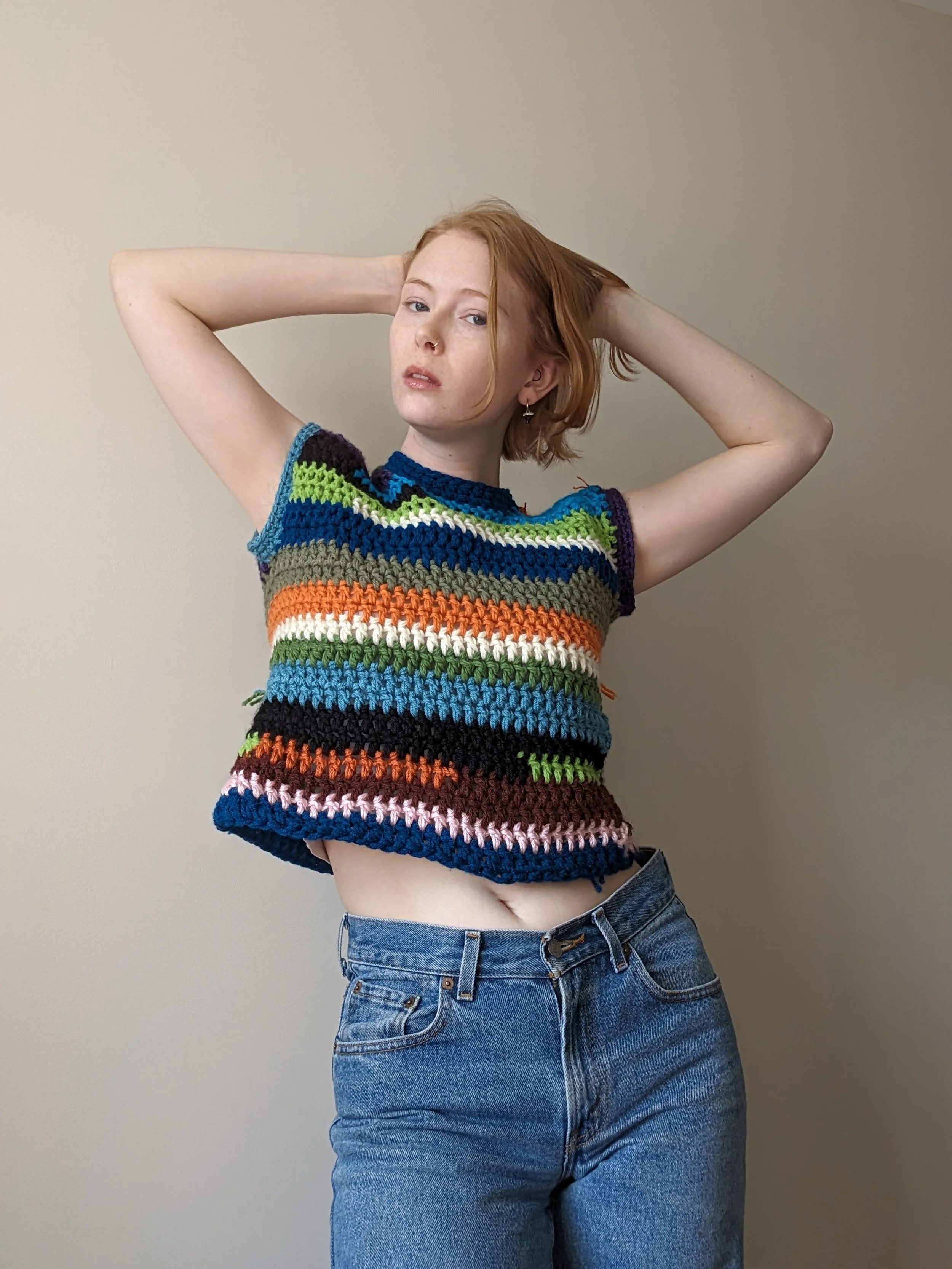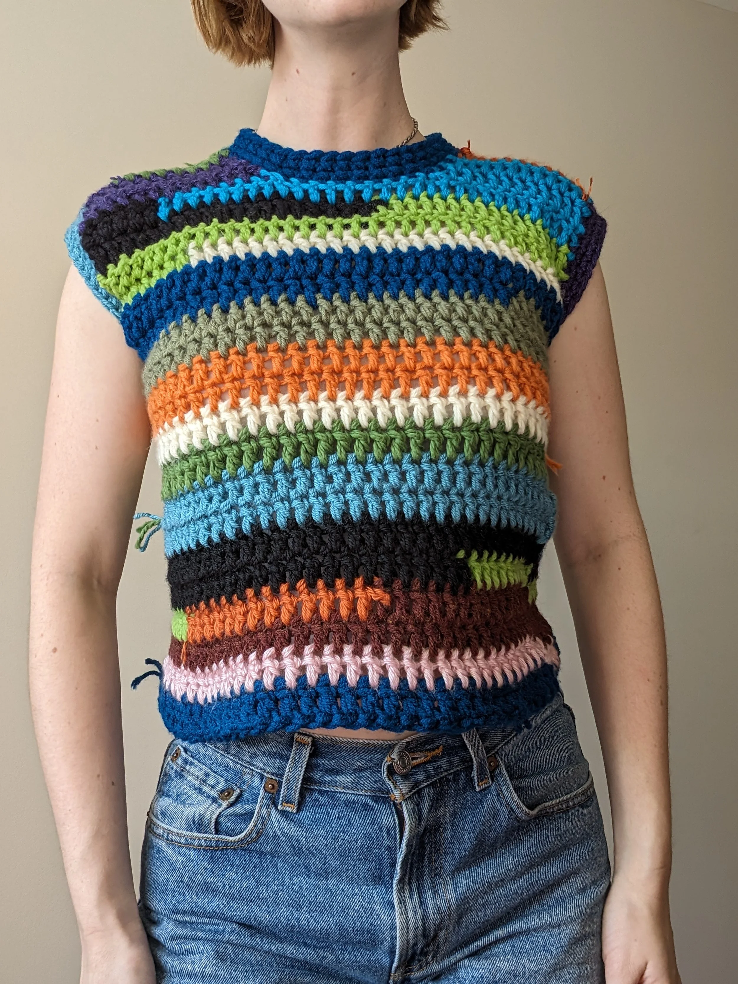 Crochet vest made of secondhand yarn for sustainability